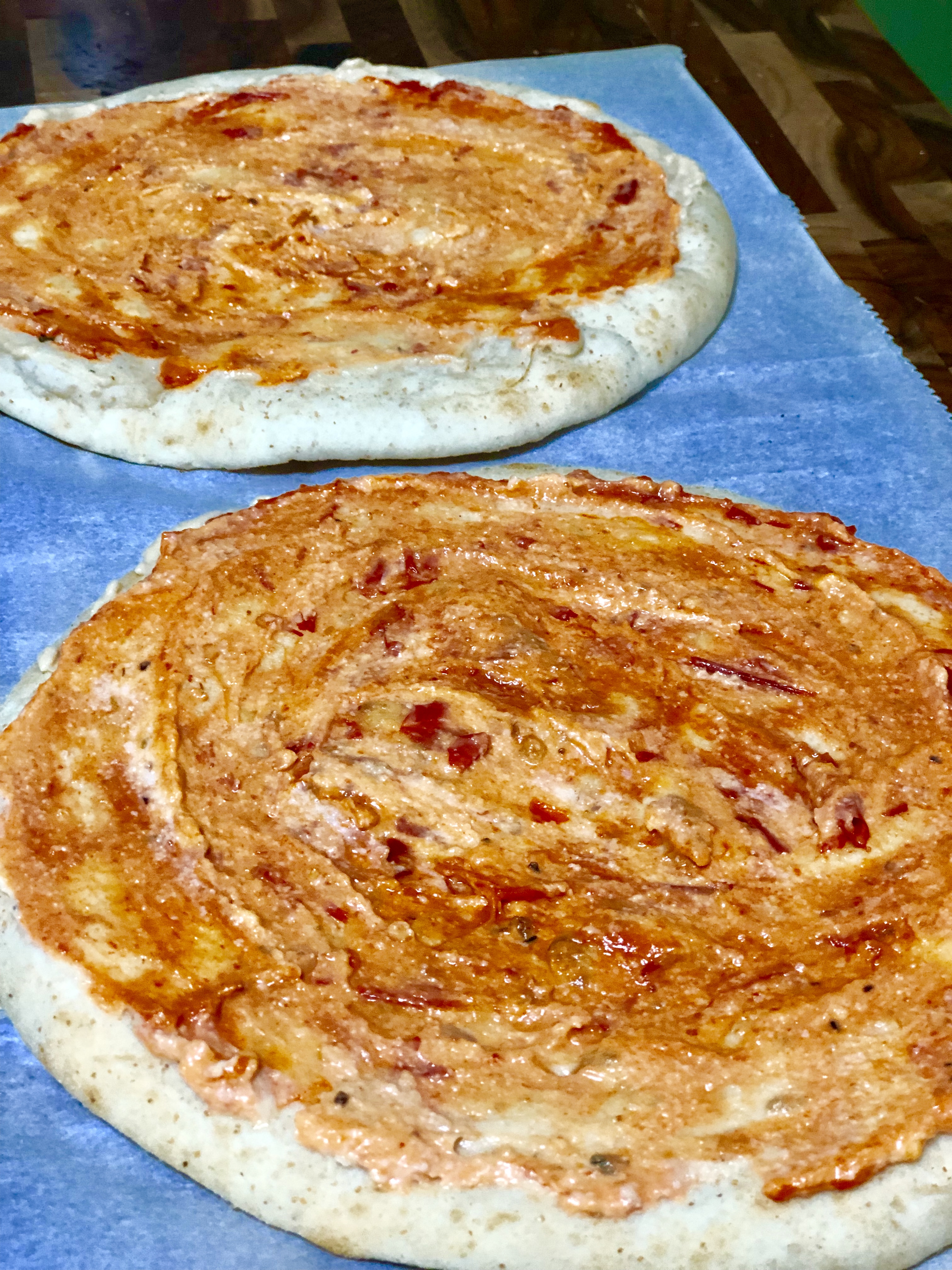 For the pizza sauce base, I start off with some roasted red pepper hummus, Harissa sauce and garlic spread. I then top with olive oil again to make sure it doesn’t get too dry.