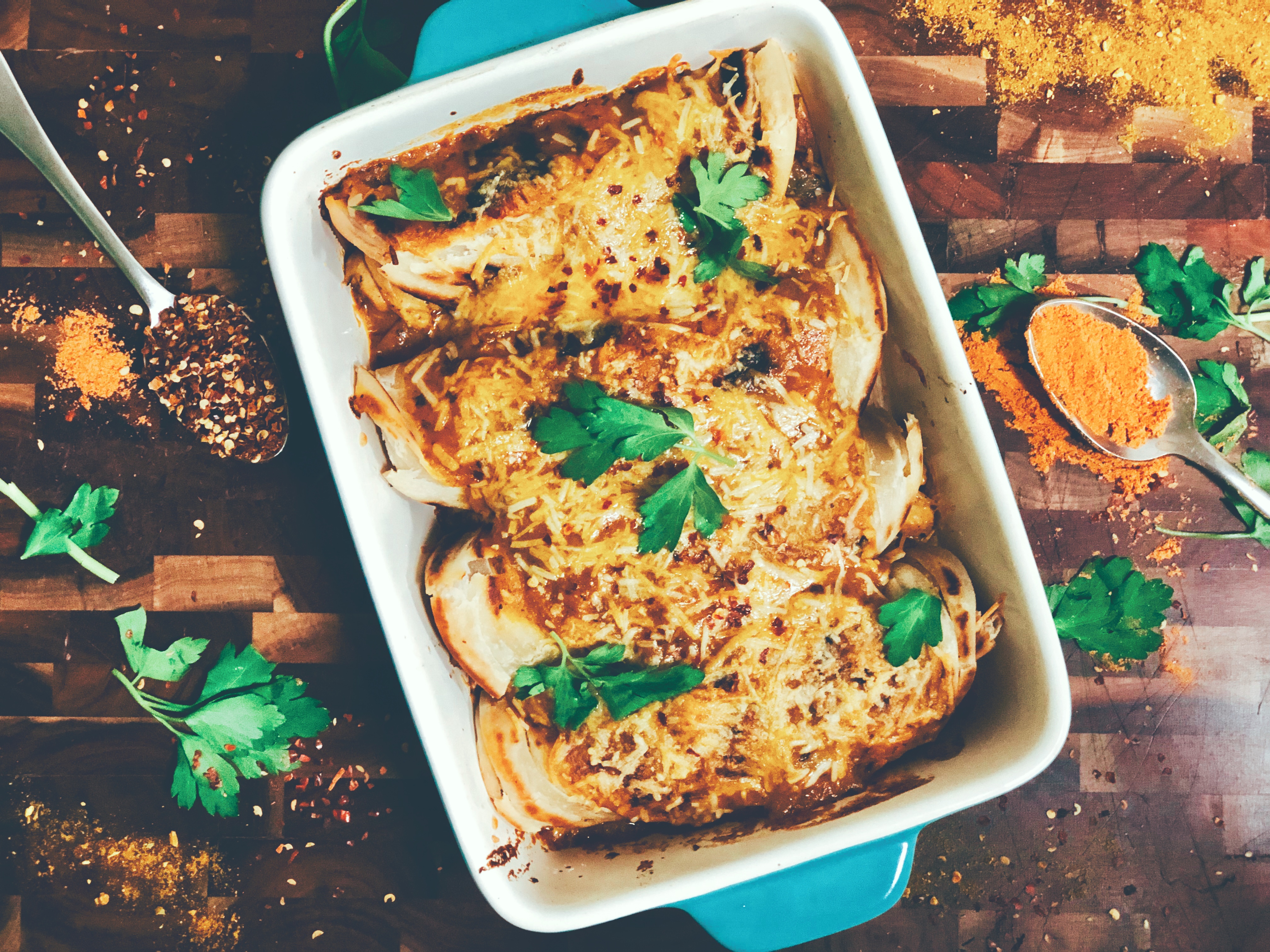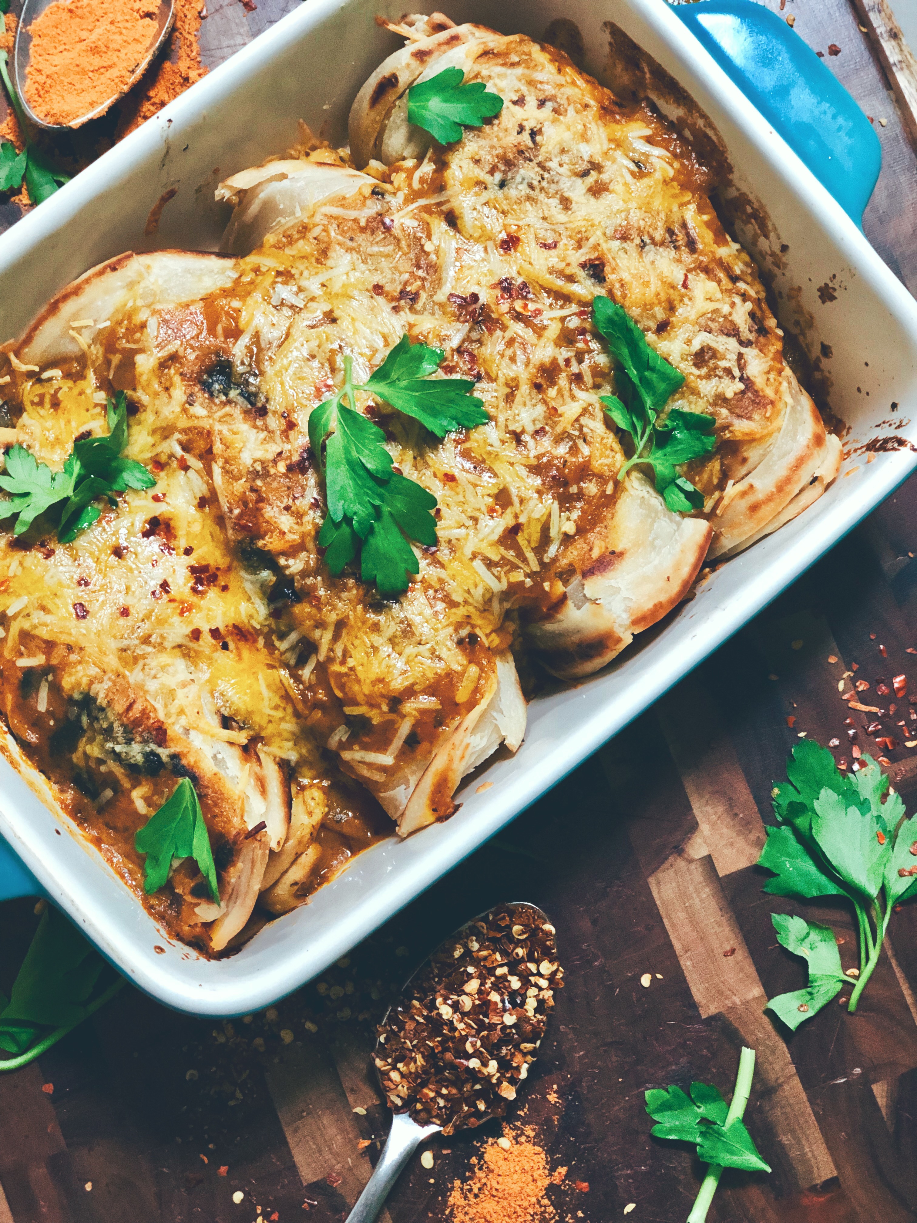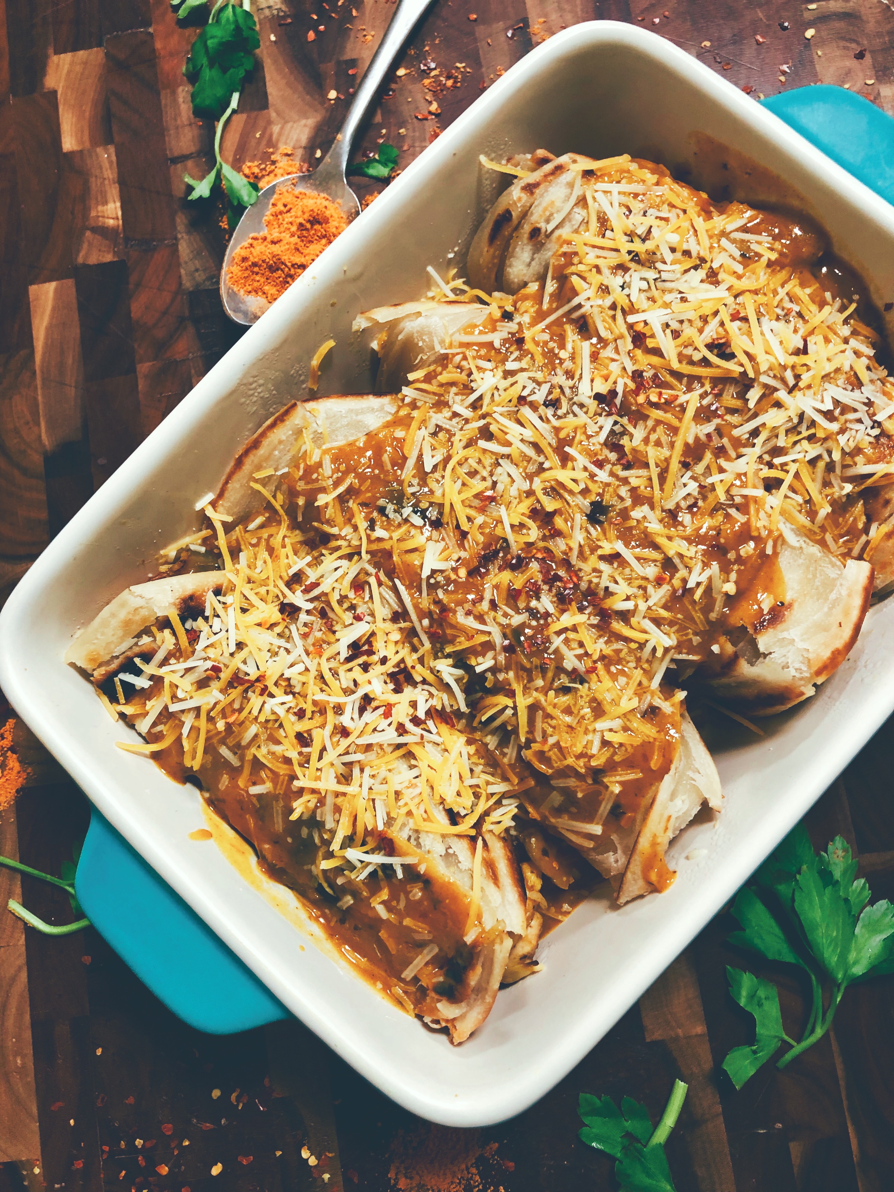 Remember the little curry I said to keep on the side? Well now is the time to use it. Whisk that up with some heavy cream over a low flame and pour it over the Naanchiladas. Top with some more cheese and then pop it in the oven for 10 – 15 minutes or until all the cheese is melted and bubbly.