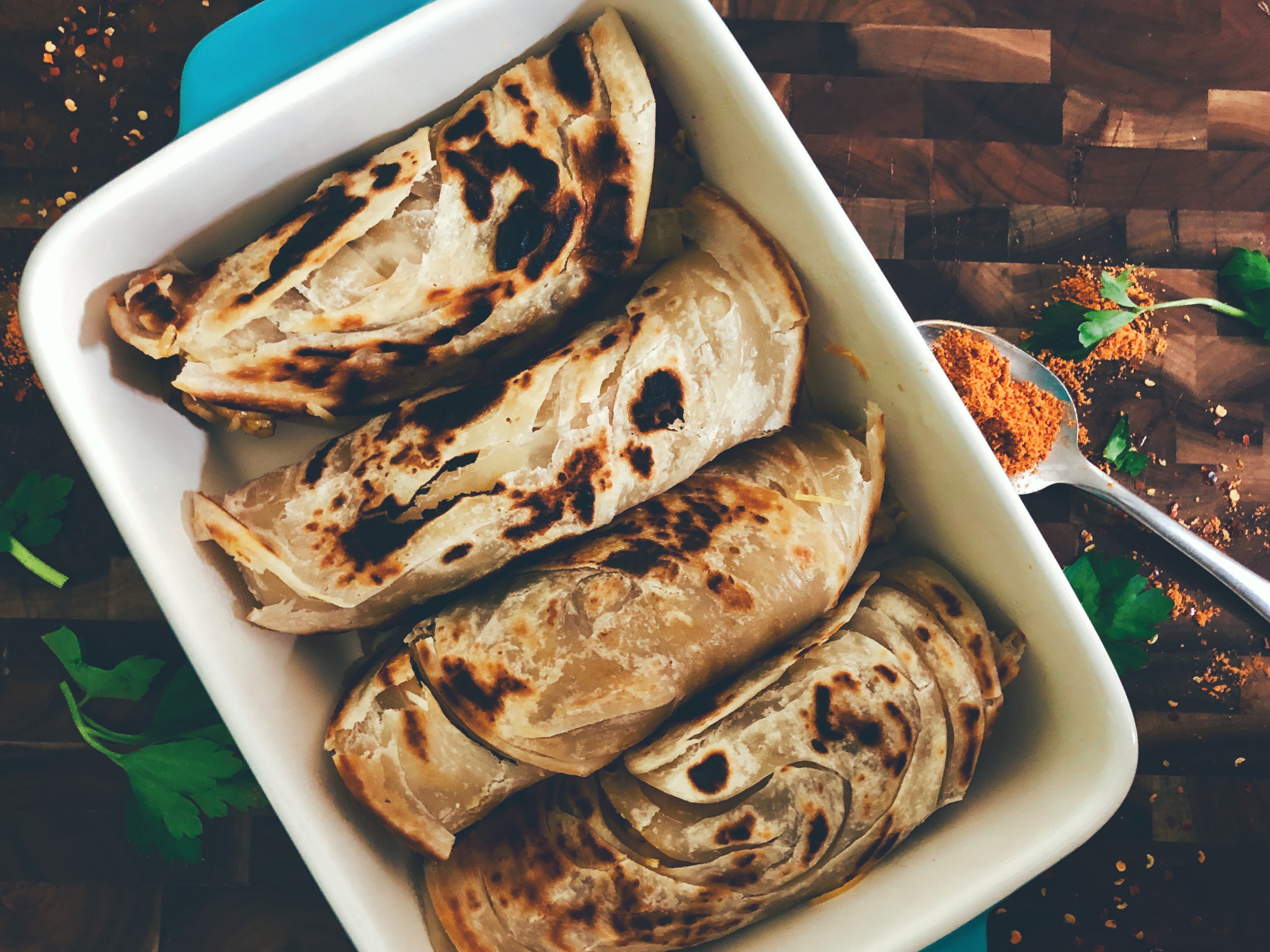 You can use either homemade or store bought naan. Trader Joes has a good variety of Indian breads and my favorite is their Garlic Naan. For this recipe, I actually used a different type of bread called “Paratha” because I ran out of Naan at home. It worked okay but this recipe is best a softer bread like Naan, Chapati or Roti.
