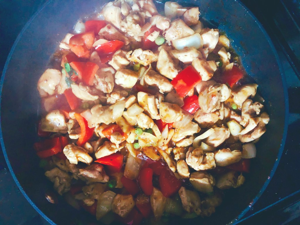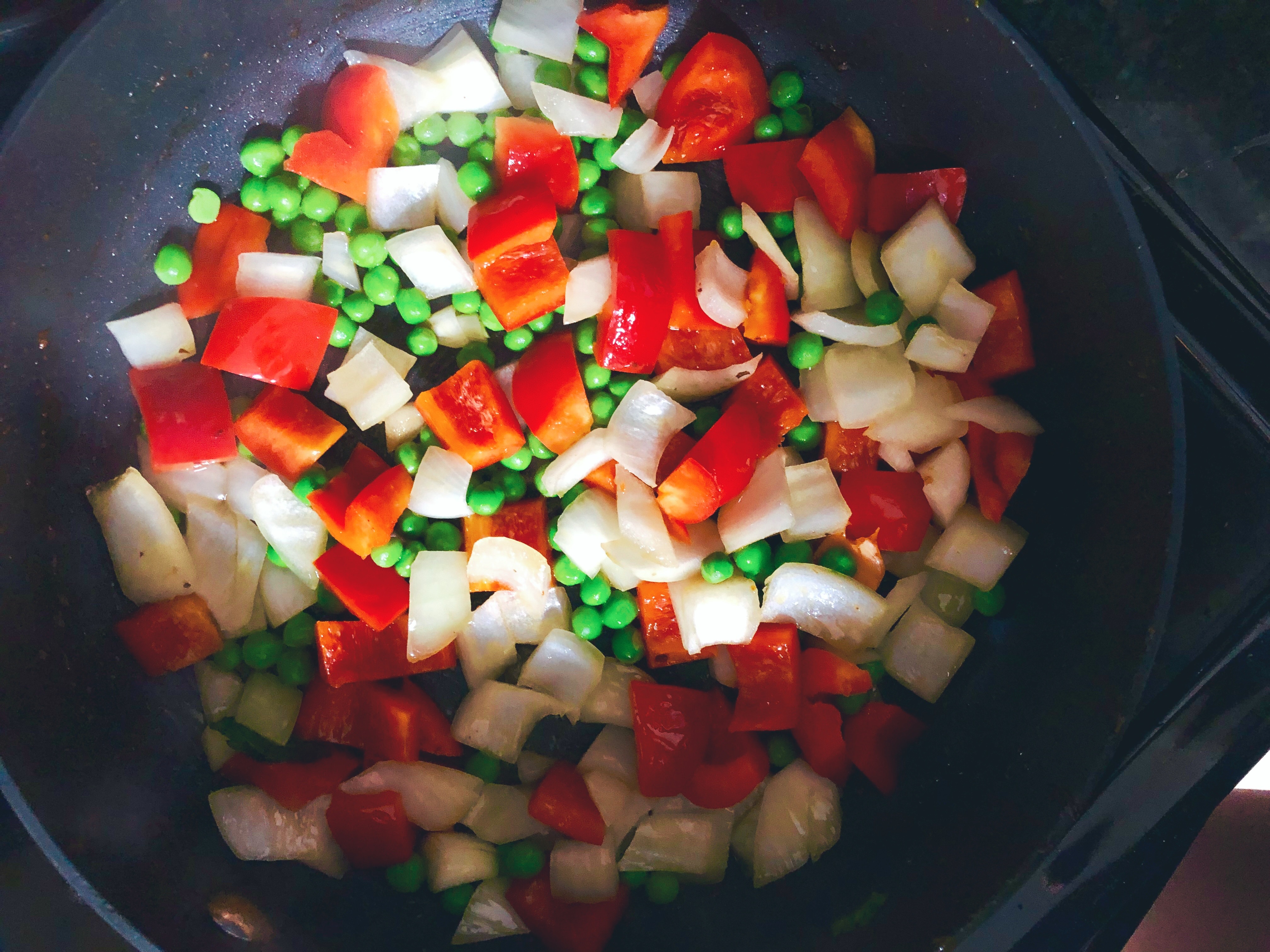 - Fry onions, red peppers and boiled green peas in a wok with some ghee or coconut oil. Add a pinch of salt and pepper for taste. Fry for 4-5 minutes or until soft.