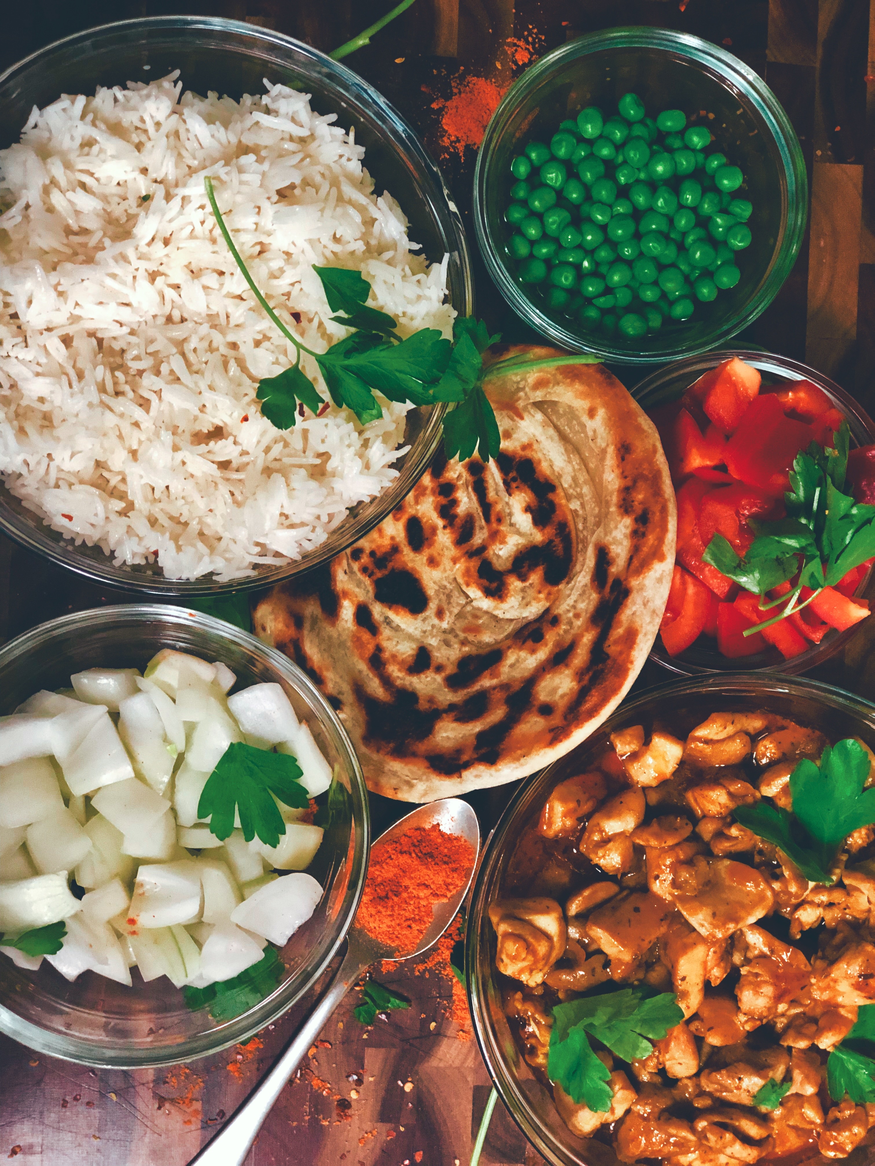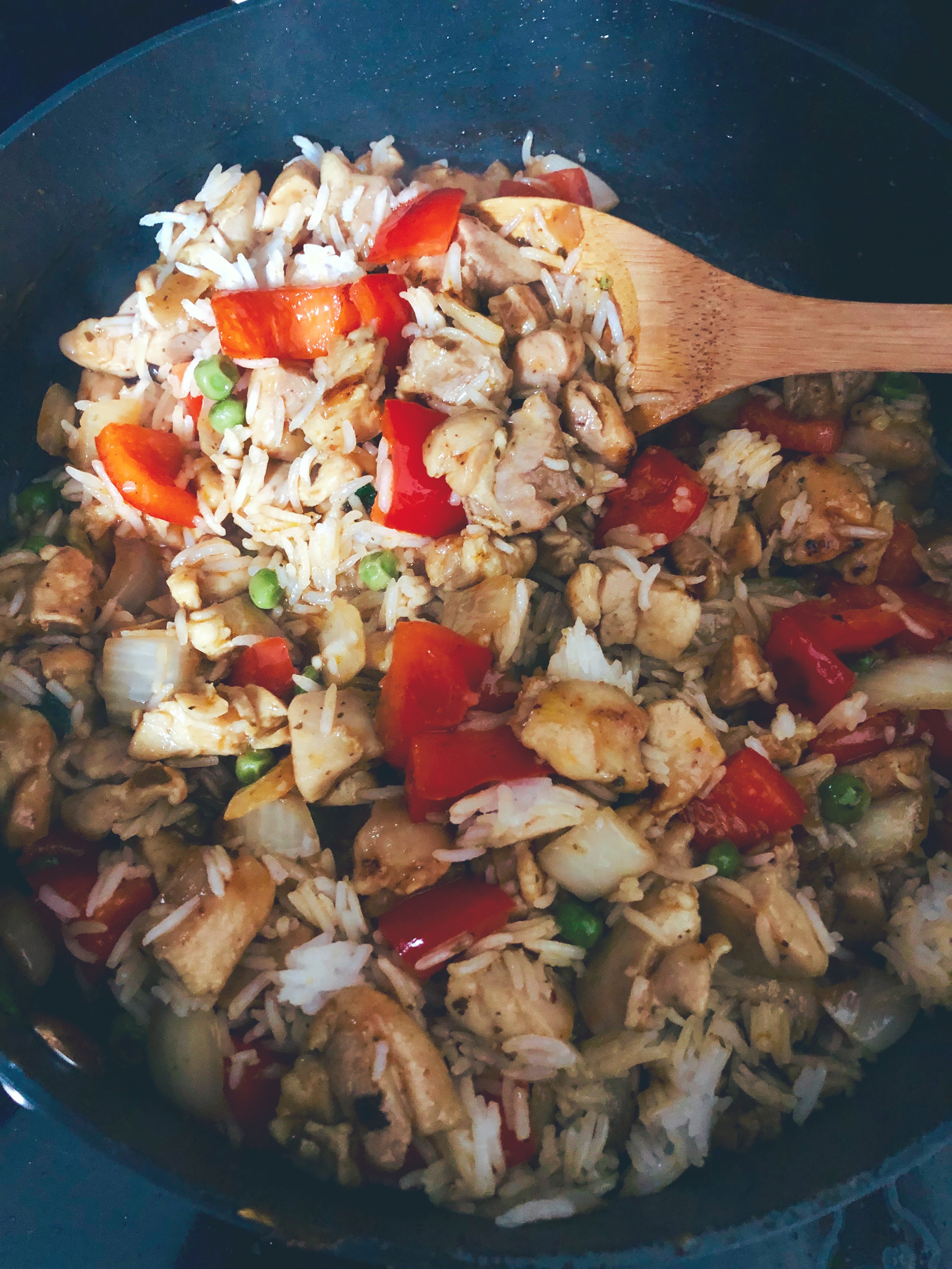 I then put in my left over Chicken Tikka Masala leaving some of the curry alone on the side so I can use it as my topping sauce. Finally, add some basmati rice and cook for 2 minutes until all the curry has been absorbed by the rice.