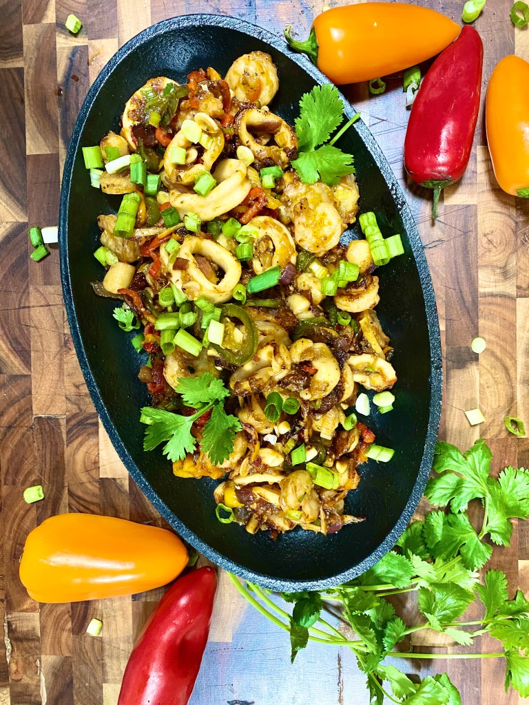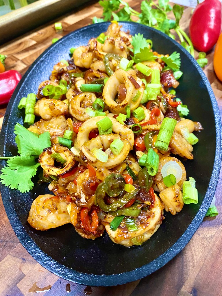 - Finally, toss in the chopped scallions and remove from heat. Serve immediately. I used a cast iron pan to serve which I already preheated in an oven. So when I placed the seafood stirfy on it, it remained hot and sizzling. Garnish with some more scallions and cilantro. Goes well served over white rice.